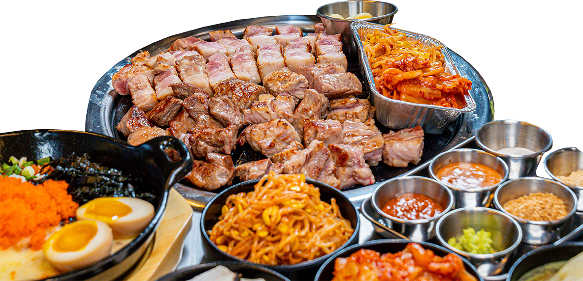 점심 한 상으로 든든하게! 다양한 고기와 사이드 메뉴가 함께 나와,